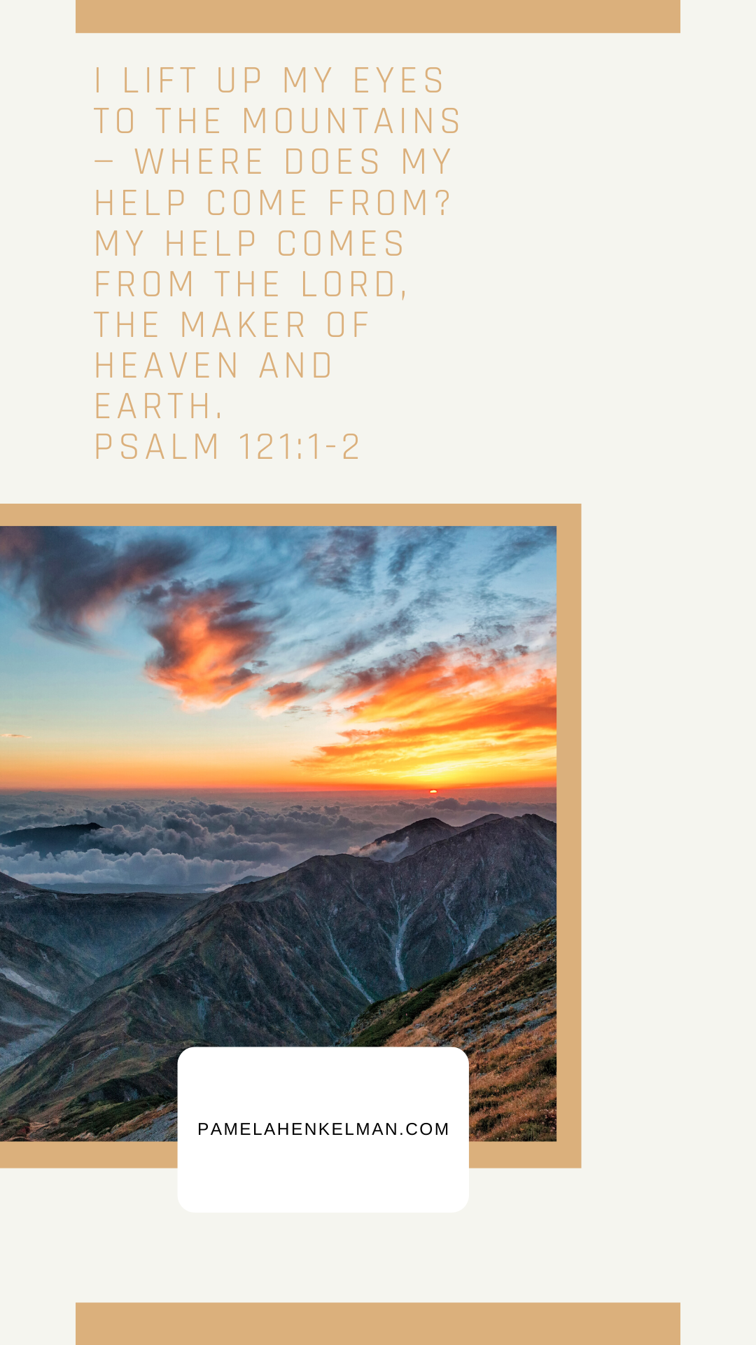 “I will lift my eyes to the mountains where does my help come from? My help comes from the Lord, the Maker of heaven and earth. He will not let your foot slip-he who watches over you will not slumber; indeed he who watches over Israel will neither slumber nor sleep. The Lord watches over you-the Lord is the shade at your right hand; the sun will not harm you by day, nor the moon by night. The Lord will keep you from all harm- he will watch over your life; the Lord will watch over your coming and going both now and forevermore.” - Psalm 121:1-8